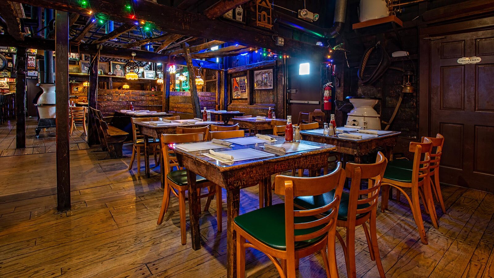 Steak, burger, salad and rib entrees with glasses of wine and beer